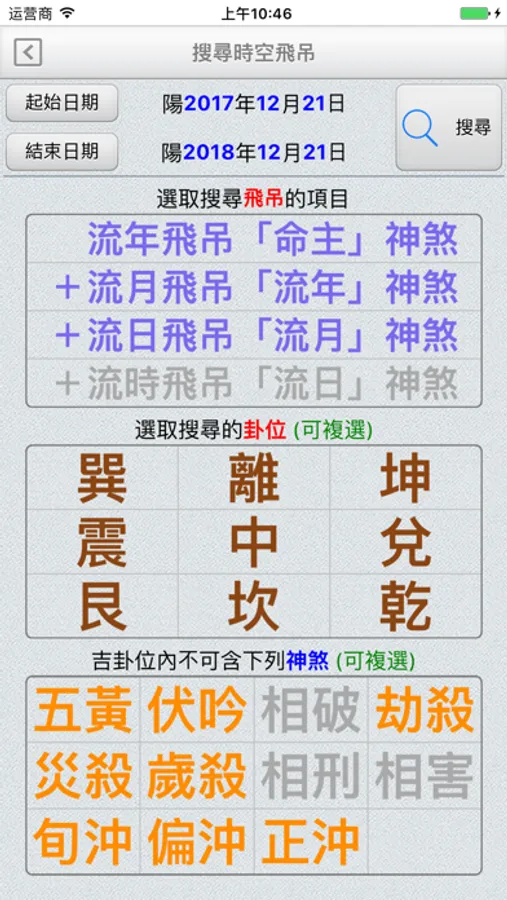 ●提供指定一個日期範圍,並指定搜尋飛吊的項目、卦位及不可含的神煞,即可快速度到符合的日時。