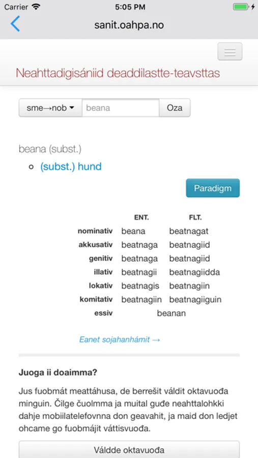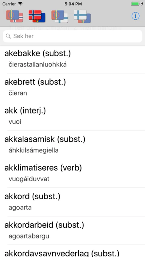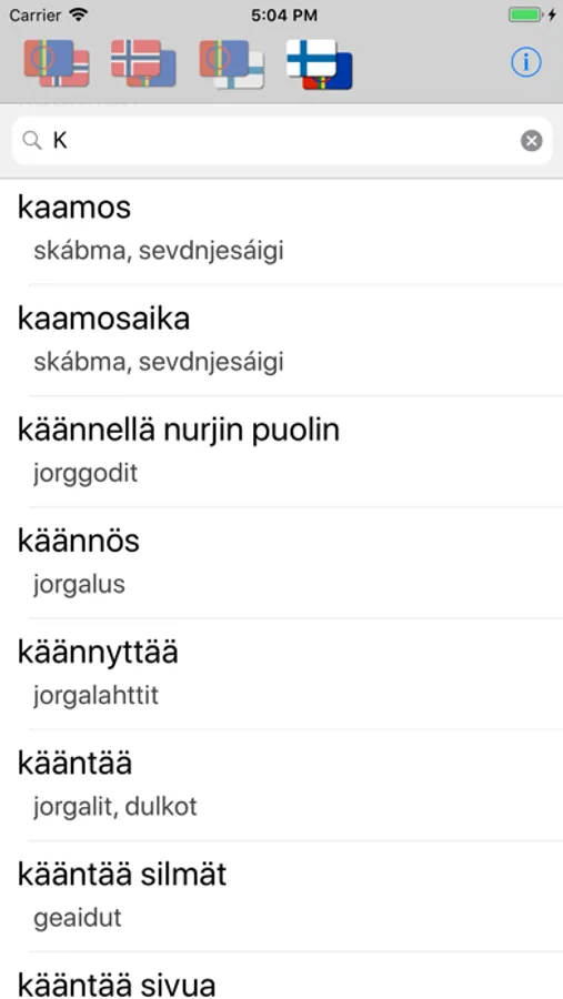 This Dictionary App includes over 30.000 Northern-Saami words. These words are translated to Norwegian (30.000 words) and Finnish (13.000 words), and Vice Versa.