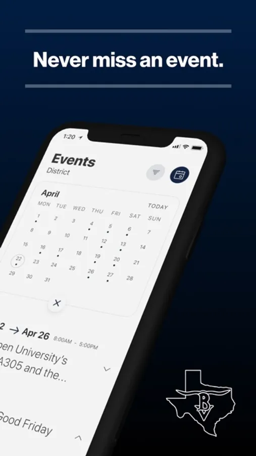 The event section shows a list of events throughout the district. Users can add an event to their calendar to share the event with friends and family with one tap.