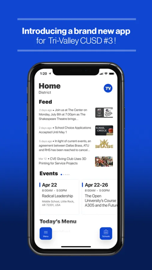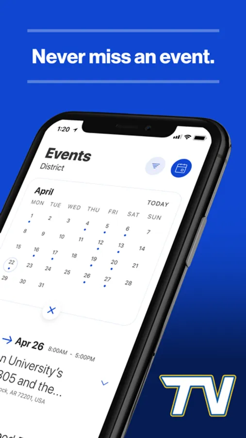 The event section shows a list of events throughout the district. Users can add an event to your calendar to share the event with friends and family with one tap.
