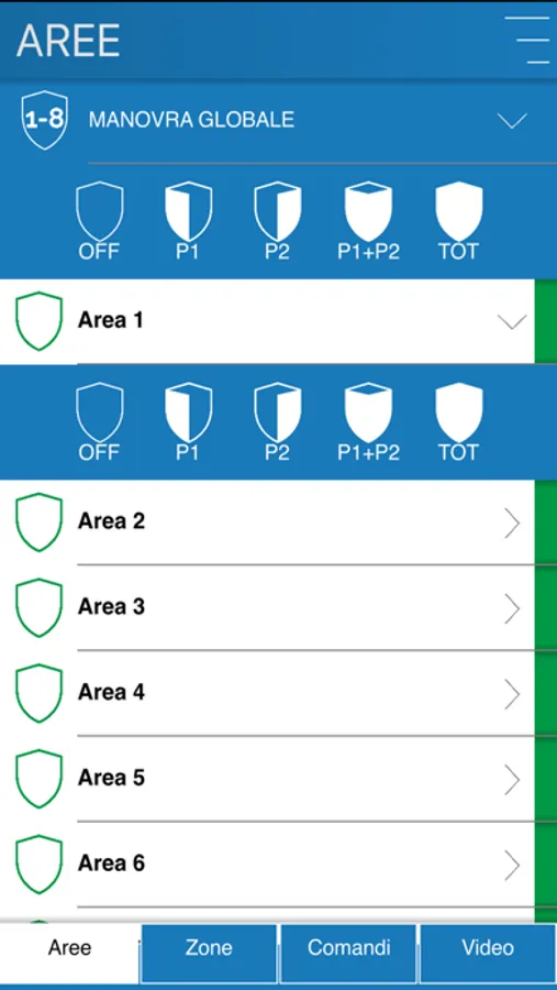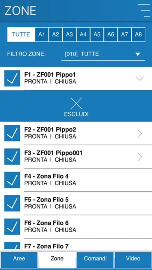 Inserimenti e disinserimenti delle Aree selettivi e/o multipli con gestione dei singoli parziali di Area. Visione IMMEDIATA dello stato di Area Non Pronta, Zone Escluse ed Anomalie, con icona dedicata e visualizzazione diretta dell'elemento di centrale toccando l'icona. Controllo totale delle Zone per stato operativo, stato funzionale e possibilità di agire per Esclusione / Inclusione ( se autorizzati ).