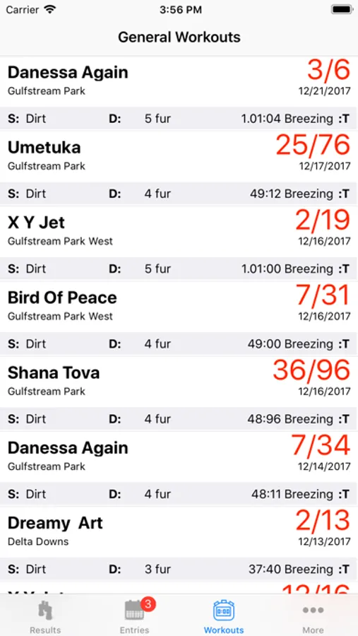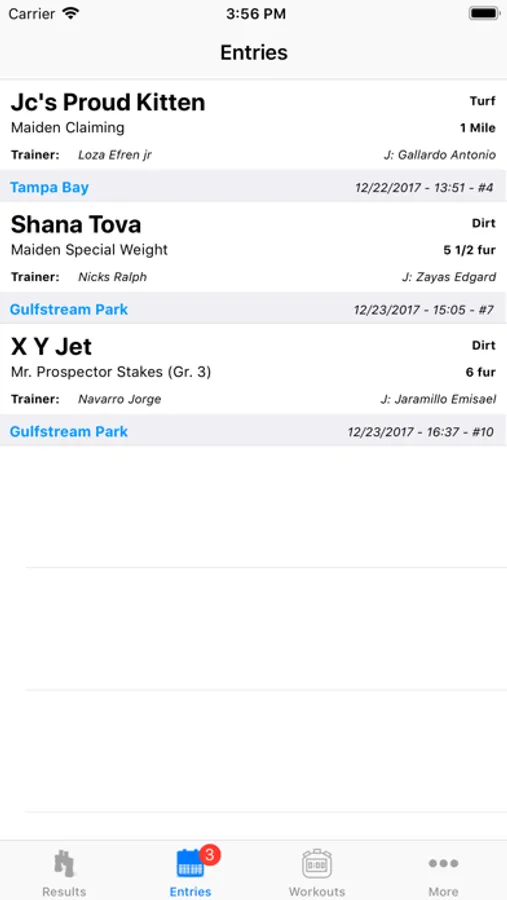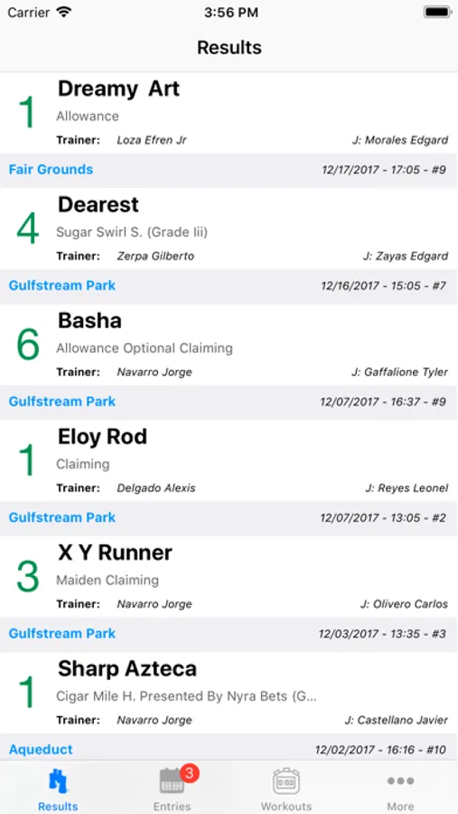 This App allows you to see information about Gelfenstein Farm horses in the campaigns in different tracks in and out the US. It counts with two main option, Entries, and Results, where entries are the races in the future and results are races in the past. Also, in the "Results" option, you can see videos and extra information of each race.