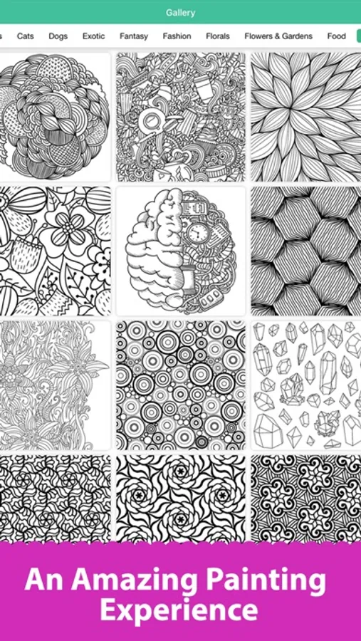 + 750+ pictures to paint: mandalas, patterns, florals, fantasy, tons of different animals, fashion, lifestyle, zodiacs, and much much more!