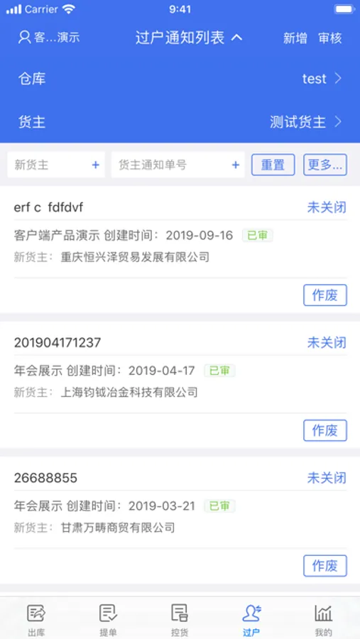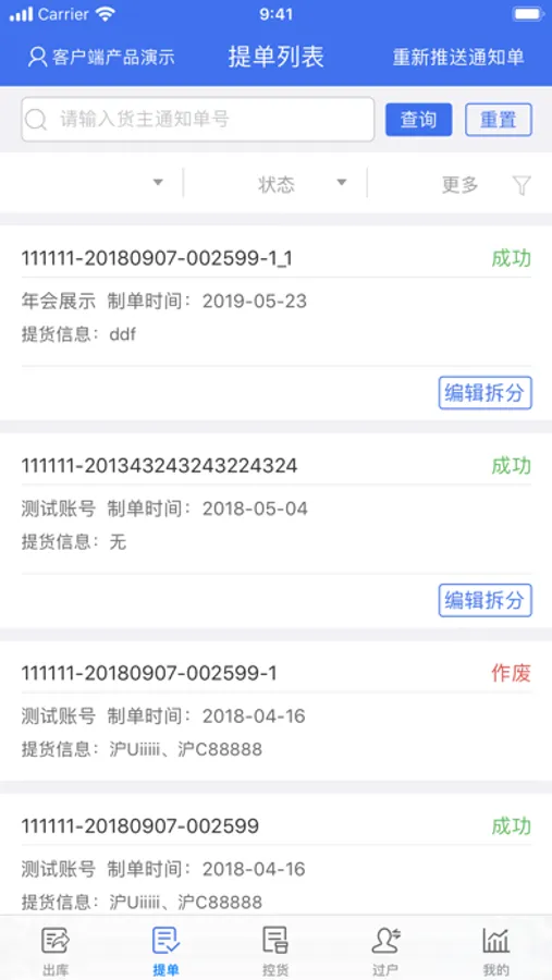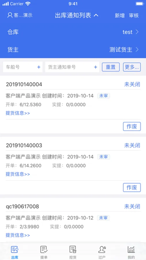 出库模块:建立出库通知,修改、作废提货信息,或进行出库通知审核;