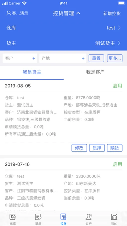 控货模块:建立控货信息,可对控货信息进行查看、修改、质押、赎货和启用/禁用操作;