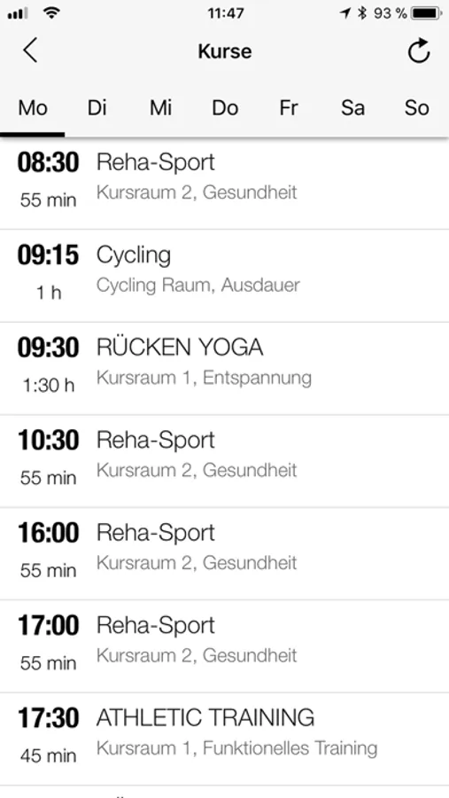 Direkter und aktueller Zugriff auf den Kursplan von überall: Für jeden Kurs kannst Du Details wie Zeit, Kursbeschreibung, Raum und Merkmale wie z.B. den Schwierigkeitsgrad einsehen.