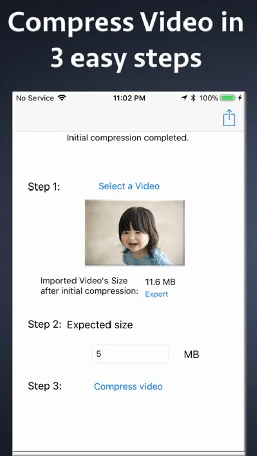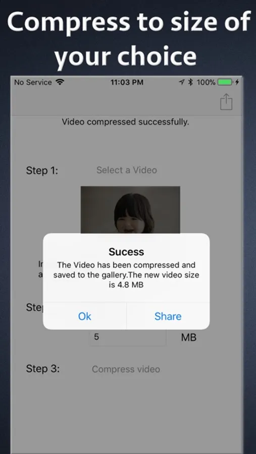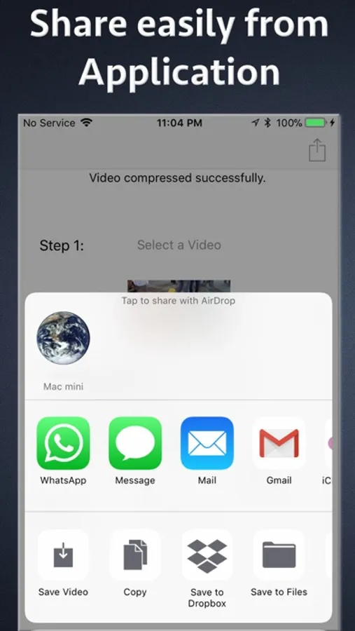 In order to compress the video, just select it from gallery ,specify the required size and click on "Compress Video" button.The application will reduce the video size and it will save it to gallery.It will also display a share page using which you will be able to share the video directly with various other applications and services like WhatsApp, iCloud, Mail, AirDrop,Save to Files,Cloud services and many more.
