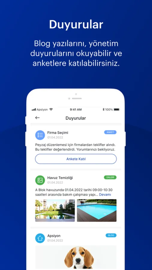 • Anket ve Fotoğraflar: Yönetiminizin sizlerle paylaştığı anketlere katılabilir, paylaşılan fotograflara yorum yazabilirsiniz.