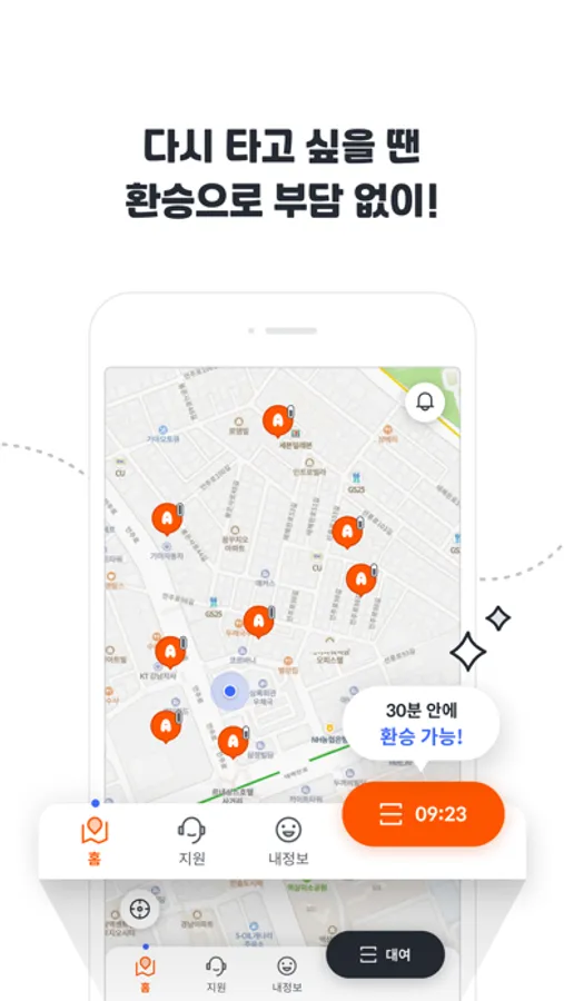 1.앱을 켜 주변에 있는 전동킥보드를 찾아보세요.