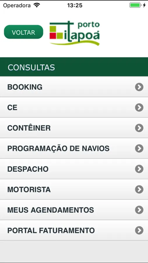 Consultas: Agendamentos, Booking, CE, Contêiner, Despacho, Navio, Motorista e Programação de Navios.