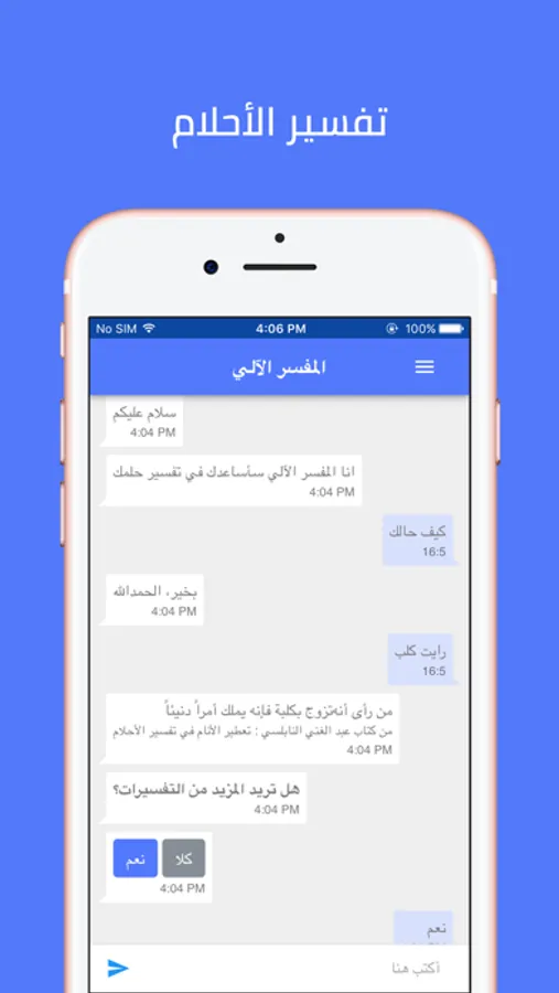 تطبيق شات بوت chatbot أو دردشة آلية هو أحدث تكنولوجيا نعتمدها لتفسير الأحلام. تطبيق شات بوت لتفسير الأحلام هو التطبيق الأول من نوعه في العالم العربي الذي يعتمد على محرك بحث ذكي لتفسير الاحلام وهو مربوط بقاعدة بيانات تضم مجموعة كبيرة من التفسيرات المأخوذة من الكتب المنسوبة الى إبن سيرين والنابلسي وإبن شاهين وغيرهم من الكتب المعتمدة في التراث الإسلامي.