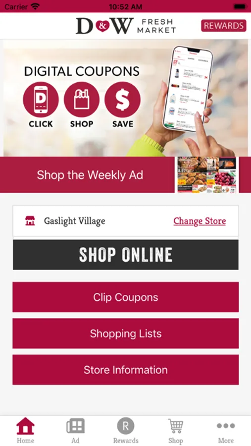 The D&W Fresh Market app helps customers easily view our weekly ad and save even more through our yes rewards program with coupons, clubs, and rewards. Enhance your shopping experience with everything you need right at your fingertips including store hours, online shopping with the Fast Lane, and more!