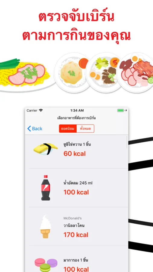 1. ตรวจจับตามการกิน โดยมีฐานข้อมูลปริมาณแคลอรี่ของอาหารมากกว่า 1,000 รายการให้เลือก