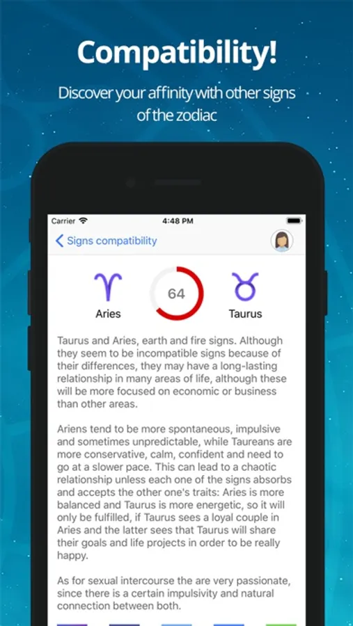 Do you want to know your complete astral profile? Select the profile option in the menu, fill in your birth data and the app will show everything you ever wanted to know: sign, astral ascendant, decanate, element, regent planet, Chinese animal, Chinese element. You can customize your profile with a picture.
