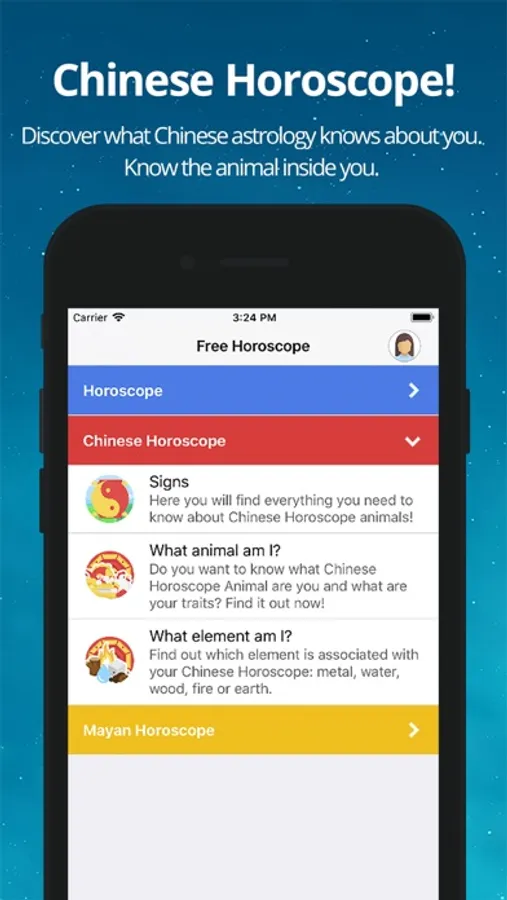 b) Chinese horoscope - Follow the Chinese calendar astrology. It is divided into 12 lunar cycles and represented by twelve animals, which mark people’s energy depending on their birthdate. These animals are: Rat, Ox, Tiger, Rabbit, Dragon, Snake, Horse, Goat, Monkey, Rooster, Dog and Pig. In addition, these animals have an associated element: Metal, Water, Wood, Fire and Earth causing their personality to change in some aspects. Do you want to know which one is yours? Download the app and find out now!