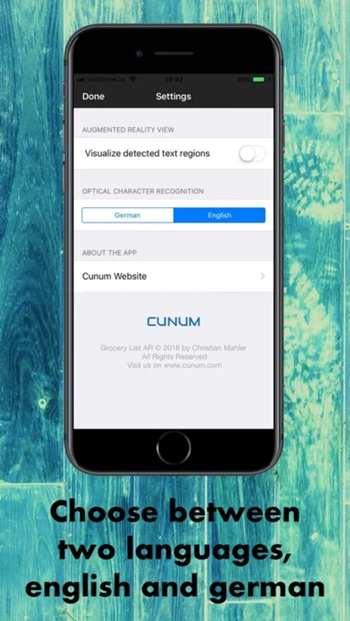 Grocery List AR enables you to easily create a grocery list from arbitrary full text like typed recipes, ingredient lists, menu cards, product labels etc. Just scan text from screen or paper with your camera, the app will display the groceries that are contained in the text in an augmented reality view next to their occurrence. By touching the groceries in the augmented reality view they can easily be added to your grocery list.