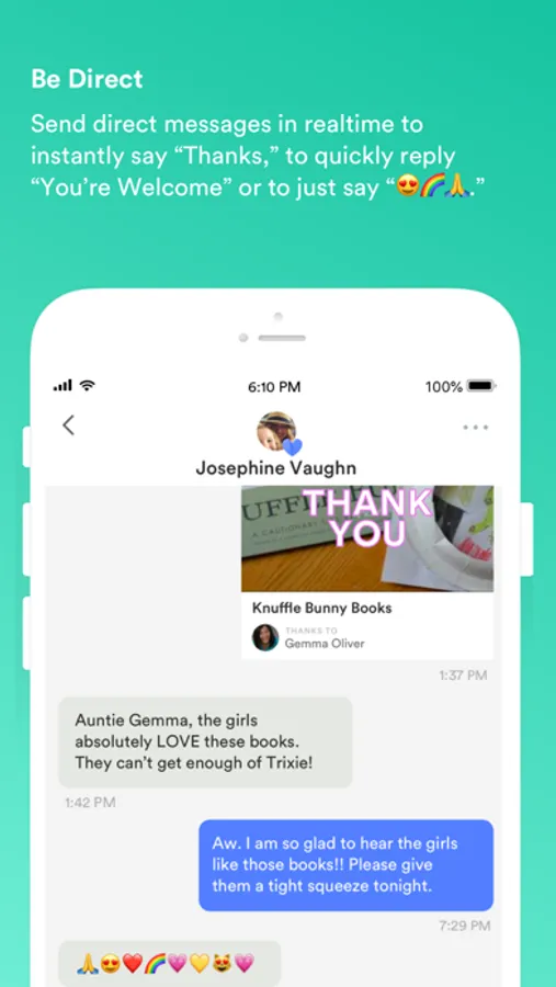 Send direct messages in realtime to instantly say “Thanks” or to quickly reply “You’re Welcome.”