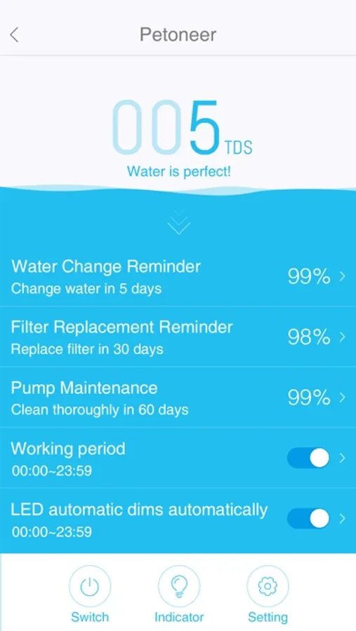 Using our smart fountain, changes in TDS values can reflect the deterioration of water quality! For some users feeding pets with mineral water beneficial to human and animals, TDS itself may have relatively high value. It is recommended for such users use TDS feature as a reference.