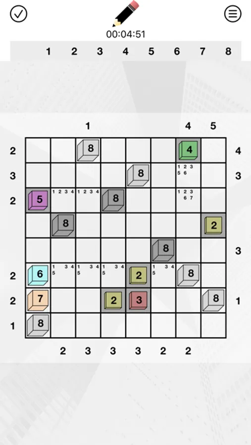 Much like sudoku, each row and each column must contain only one skyscraper of any given height.