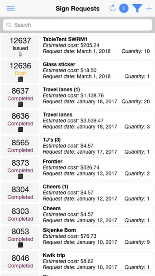 This application is designed for the requestor of signage and includes the ability to follow the status of all of their requests, filter results, and a search to find existing requests, or previous requests. Each requestor will be able to duplicate an existing request, edit requests, attach images and documents to your requests, and so much more.