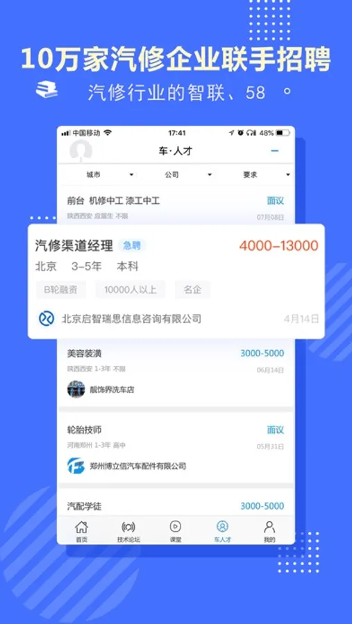 4.人才招聘:与全国10万家专业汽修机构深度合作,在平台发布人才招聘信息,让优秀学员无后顾之忧,轻松找到优质的工作机会。