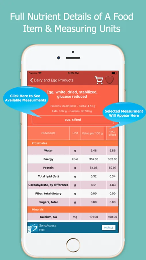 • Complete nutritional detail of each food item with all possible food measurements