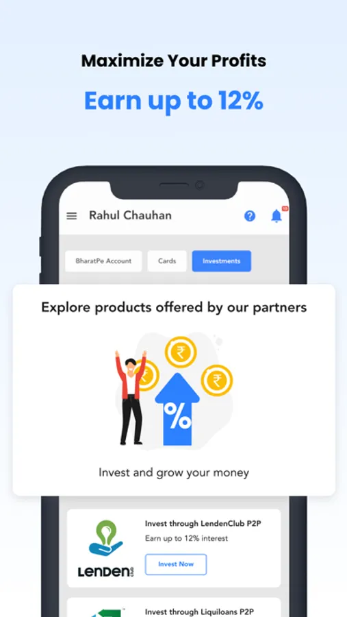 You can earn up to 12% interest on your BharatPe account balance. Your interest is credited to your BharatPe account daily. You can add money or request withdrawal anytime. Your money is invested with RBI-approved NBFC partners.