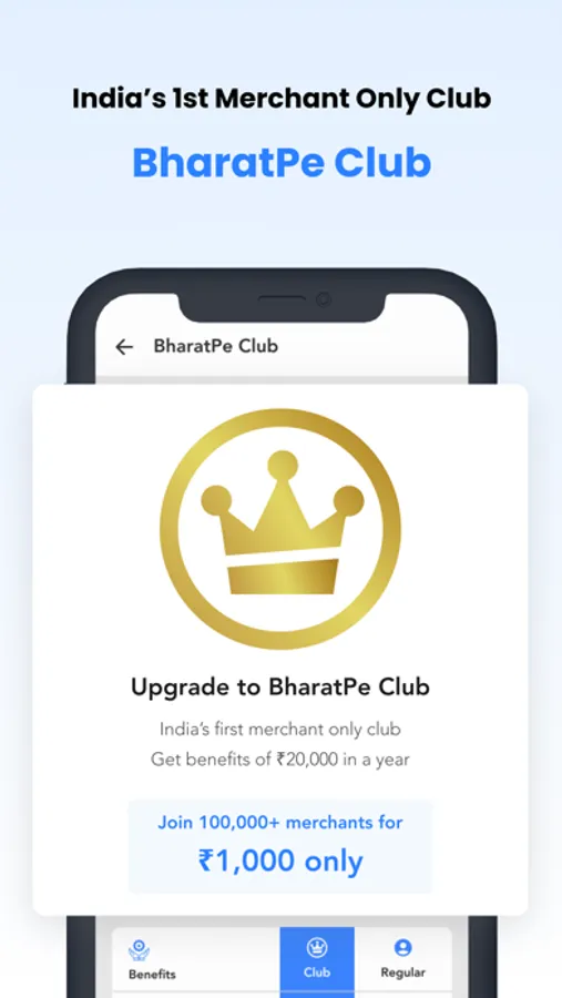 India's first merchant loyalty club BharatPe Club is India's first merchant loyalty club. You can earn benefits worth Rs. 20,000 such as free cricket merchandise, zero loan processing fees, Rs.1,000 off on BharatSwipe, and Rs. 500 in a BharatPe card.