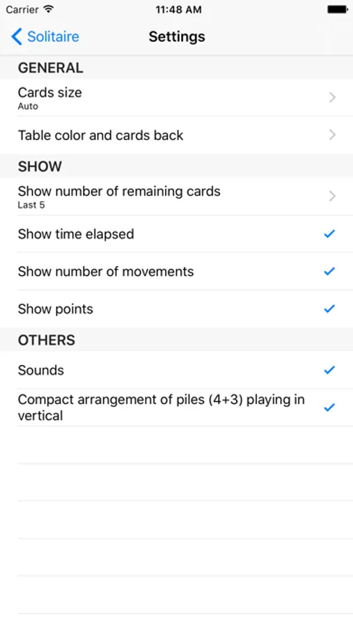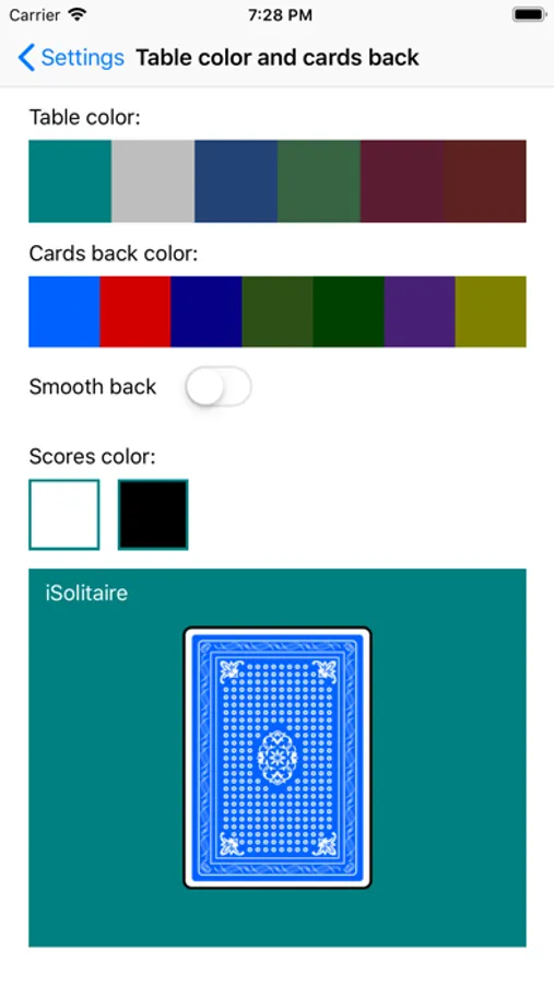 - Settings: Cards size, cards back color, sound, scoreboards, table and scores color,...