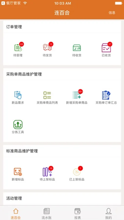 连百合供应商为餐饮行业供应商提供产品管理和订单管理。