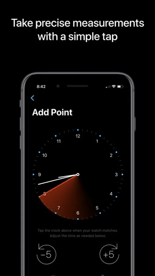 When adding a measurement, if your watch is ahead of the time shown on the screen, or significantly behind, you can adjust the target time to get closer. Use the -5 and +5 buttons until the hands are slightly ahead compared to your watch, then wait for your watch to catch up, and tap.