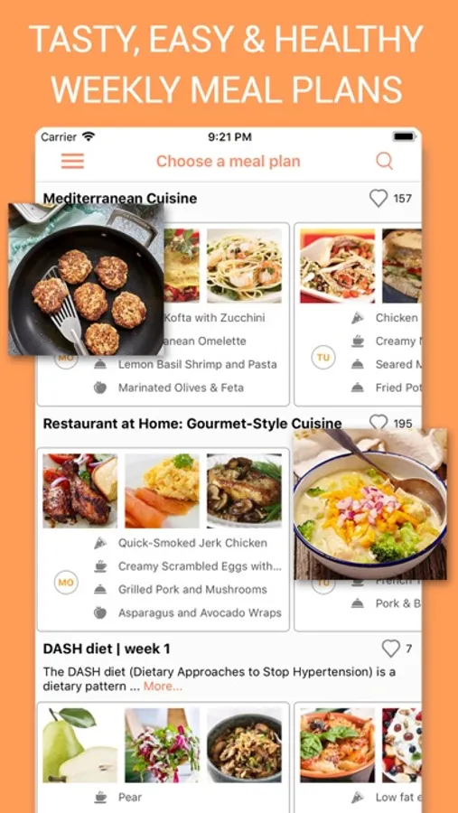 • Thoroughly arranged weekly menus: easy, complex, dietary, vegetarian, and more.