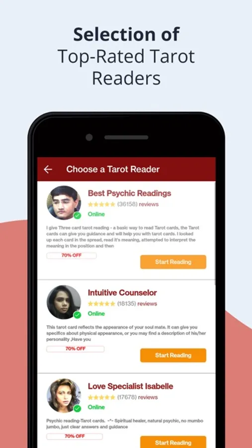 Also completely FREE is your first 3 minutes with every live Tarot reader who’s new to you. Get to know the different psychic readers who offer their services through our platform, ask them questions, get a short reading or start a detailed one, get a quick preview into their reading style to be able to choose the best reader for your changing wants and needs.
