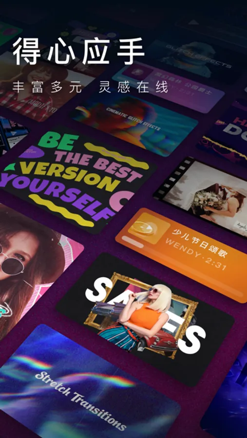 丰富且高优质的创作素材,尽情释放你的创作灵感(音效、特效混合层、转场、字体、遮罩、纹理、滤镜);