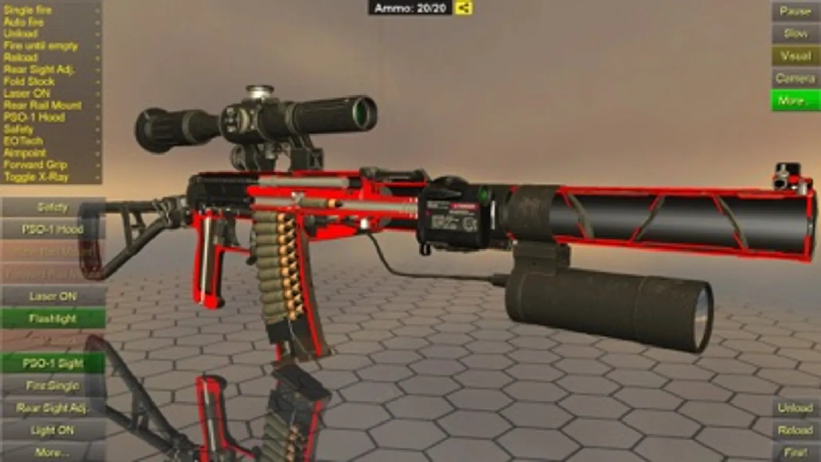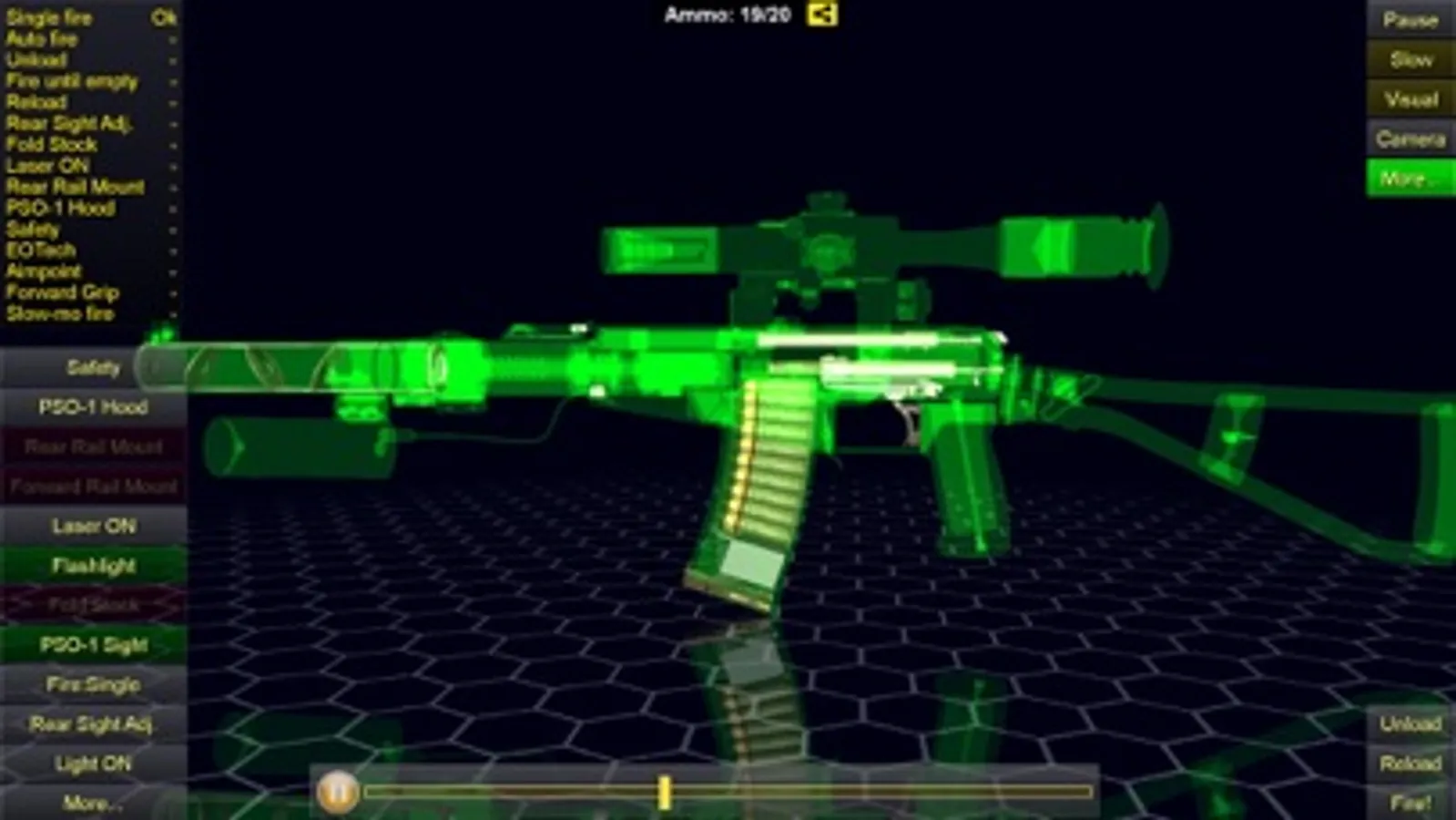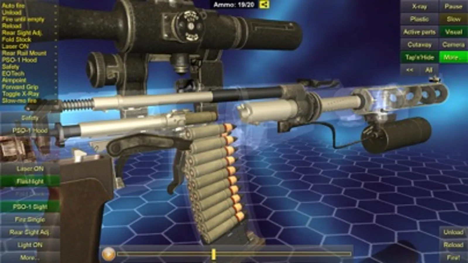 - Operation animations: semi and full auto fire, unload, reload, safety