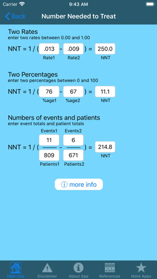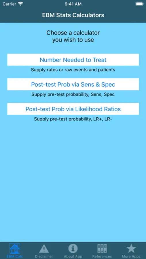 Occasionally in medicine, we really need to "do the math". This app will help. EBM Stats Calc let's a clinician do calculations that are hard or impossible to do in one's head. A clinician can get NNT's (number needed to treat) from rates, percentages, or raw event and patient numbers. And a clinician can use sensitivity and specificity or likelihood ratios (LR+, LR-) to go from a pretest probability to posttest probability and positive predictive value and negative predictive value.