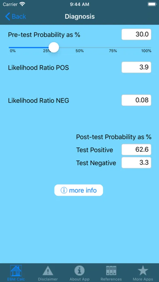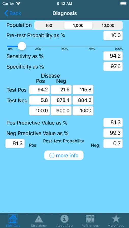 Although these calculators themselves are somewhat novel for apps, the unique tool in this app is for educators. Students and residents have a hard time understanding how the utility of a test can vary with pretest probability. Instead of saying it in words and hoping they get it, now you can demonstrate it. A test might perform well, giving good PPV and NPV, when pretest probability is in a certain range. But slide that pretest probability up or down and see the diagnostic utility change with the numbers flying right before your eyes. The tool also shows a student that in many cases, an imprecise estimate of pretest probability doesn't much matter. Different doctors might judge a clinical case to suggest likelihood of disease (pretest probability) of 40%, 50%, or 60%. The slider tool shows that the differences may not matter, and the test in mind will render good clarity regardless of differing opinions on pretest probability.
