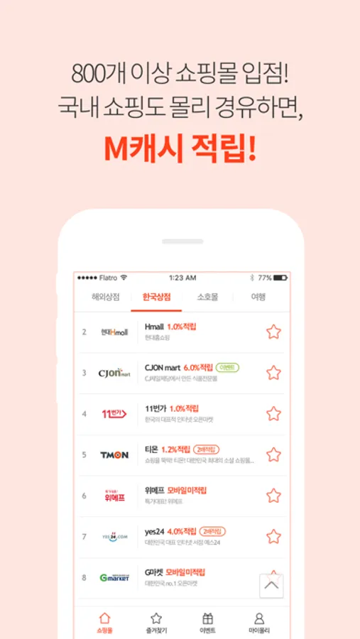 몰리에서 제공하는 약 800여개 국내, 해외 사이트에서 쇼핑하시면 최대 20%까지 캐시백을 제공해드립니다.
