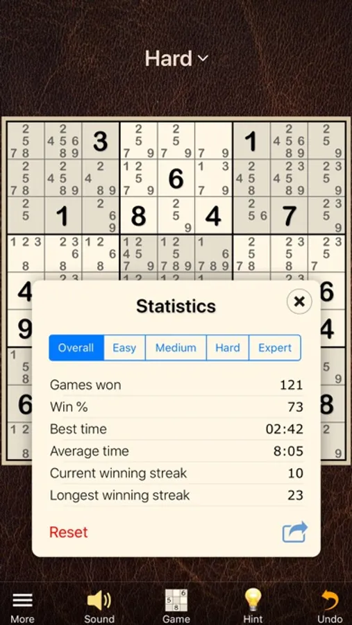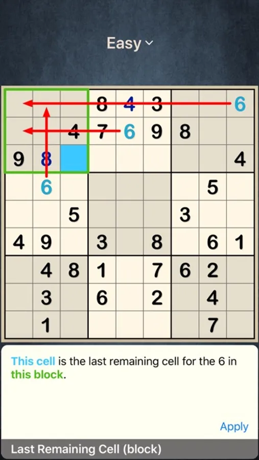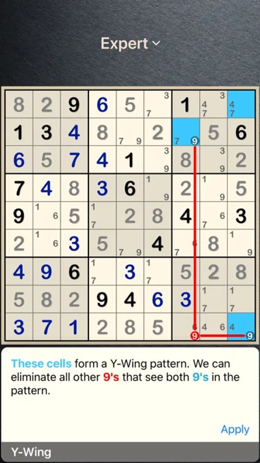 The game offers unlimited Sudokus in four difficulty levels from easy to expert. Each puzzle can be solved with logical reasoning; no guessing required. If you are new to Sudoku or want to try the next level up, use hints to learn new strategies. The advanced hint system will explain the logic behind each pattern and how to find it on your own. You will see that most of these strategies are not that difficult, even though it may be hard to find them on the board.