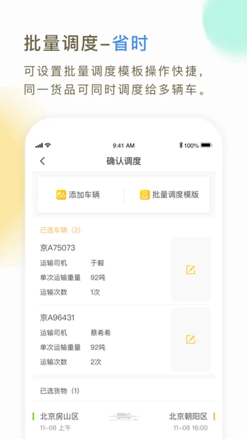 智能调度:承运方可随时随地查看运单状态,实时掌握司机、车辆的运输状况,移动在线调度、跟踪,有效降低沟通成本,提高工作效率。