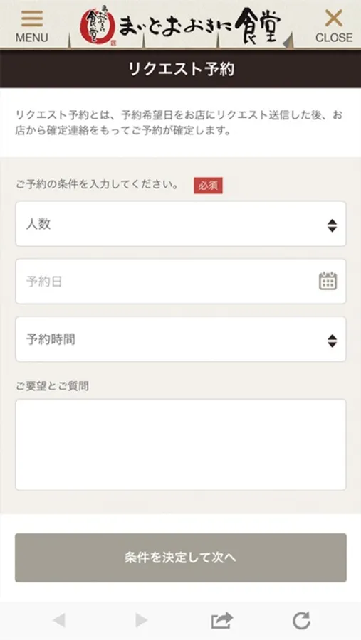 希望の人数・日時を指定して送信するだけで予約を依頼できます。