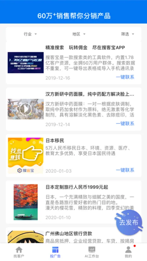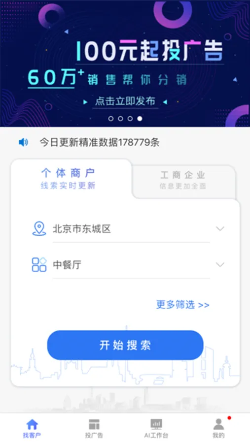 搜客宝是一款运用大数据技术从数据挖掘、数据分析一站式解决客户获取难,不精准的问题,为您推荐更多的潜在客户,在这里,您可以按照城市区域、行业分类来精准查找到您想要的资源。