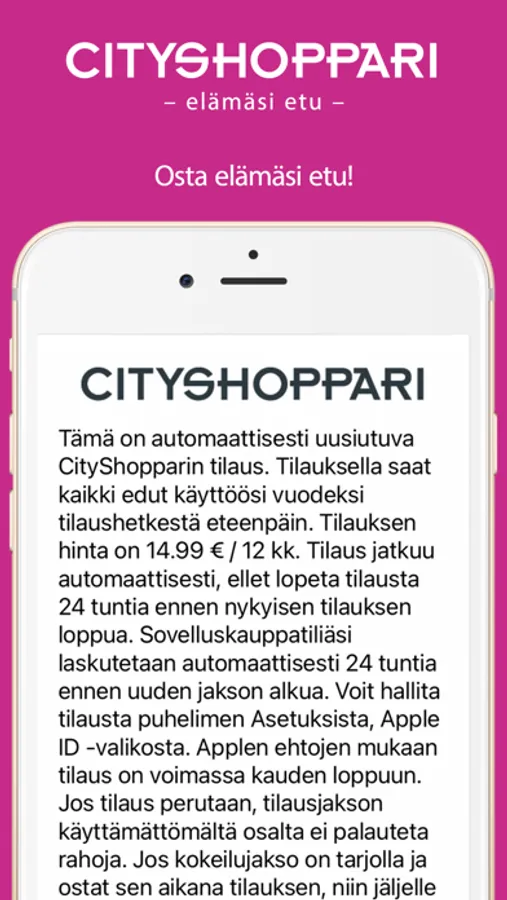 Tilauksella saat kaikki edut käyttöösi 12 kuukaudeksi tilaushetkestä eteenpäin. Apple-tiliäsi laskutetaan 24 tuntia ennen uuden jakson alkua. Tilaus jatkuu automaattisesti ellet lopeta tilausta 24 tuntia ennen nykyisen tilauksen loppua. Maksu veloitetaan Apple-tililtäsi tilauksen uusimisen yhteydessä. Voit hallita tilausta omalla Apple-tililläsi. Applen ehtojen mukaan tilaus on voimassa kauden loppuun. Jos tilaus perutaan, jakson käyttämättömältä osalta ei palauteta rahoja. Maksun hyvitystä on mahdollista pyytää oman sovelluskauppatilisi kautta 14 vuorokauden sisään maksutapahtumasta. CityShoppari ei vastaa maksun palauttamisesta.