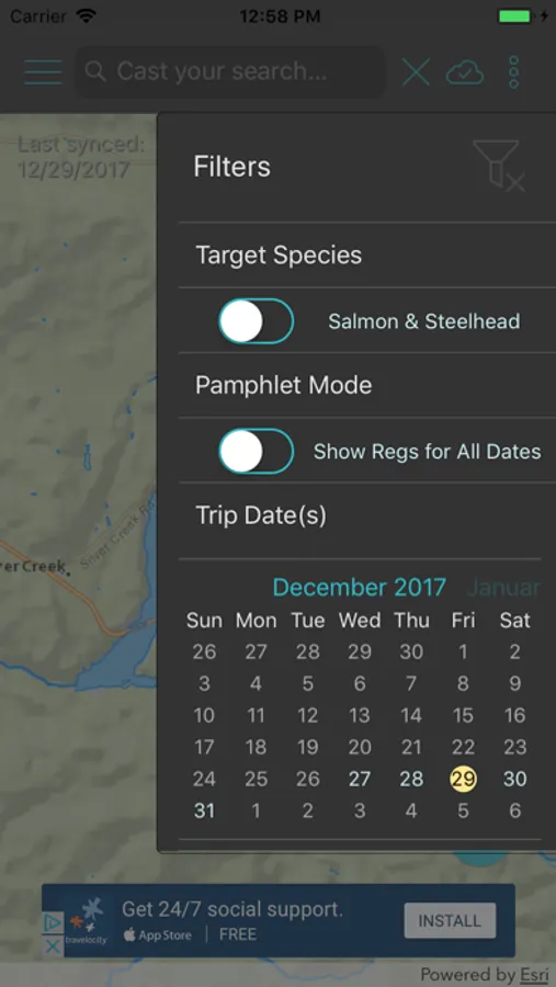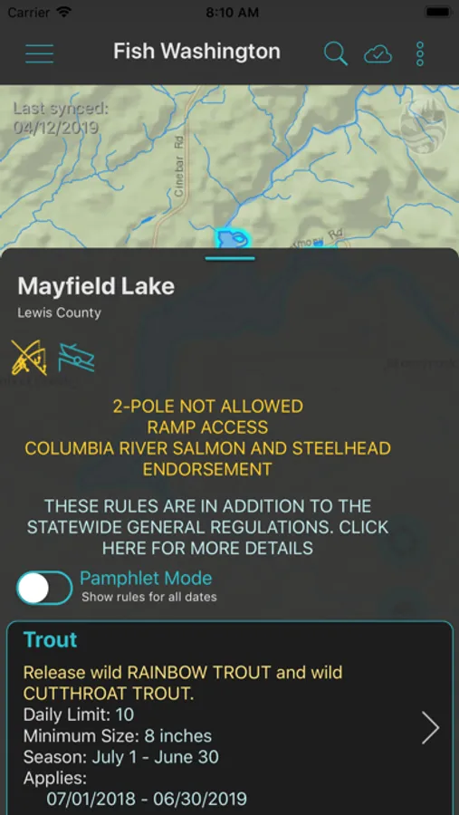 Tap on a body of water to see what you can fish for and retain, gear restrictions (if any), etc.