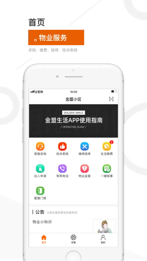 金盟生活App是一款专门针对小区业主开发的一款智能物业管理App,是以物业服务、智能社区、生活服务为核心的创新型物业服务工具,让业主的生活更加便捷、安全、舒适、幸福。