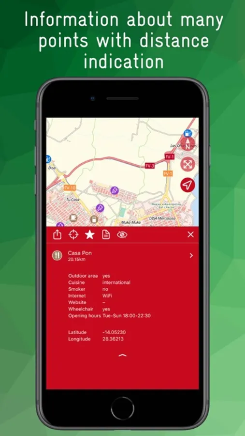 For many POIs there is further information such as opening hours, address, disabled access, ... Notes or favourites can be created for each POI, a history list shows the most recently used POIs, content can be shared.