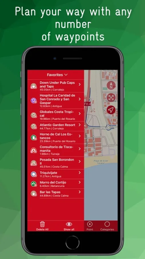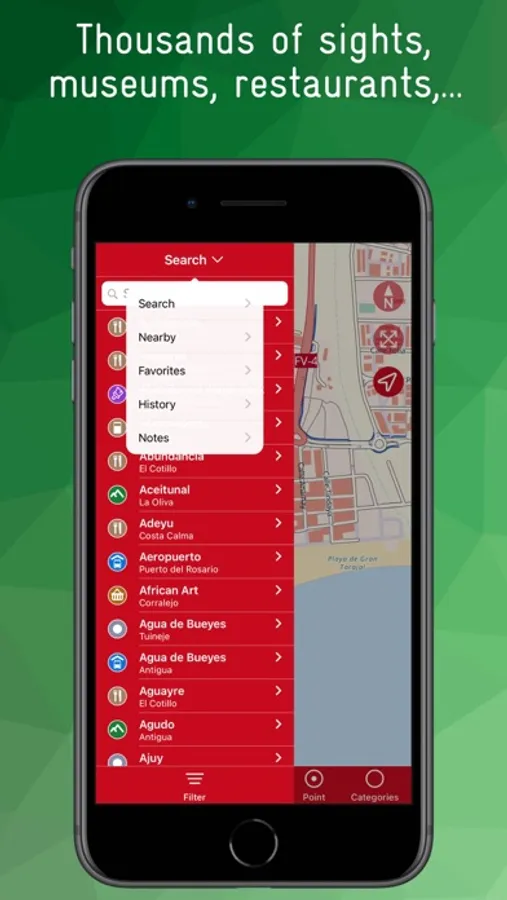 An integrated database allows you to search for POIs as well as a large number of streets, towns, villages, districts, etc. The search can be filtered by category and/or distance.