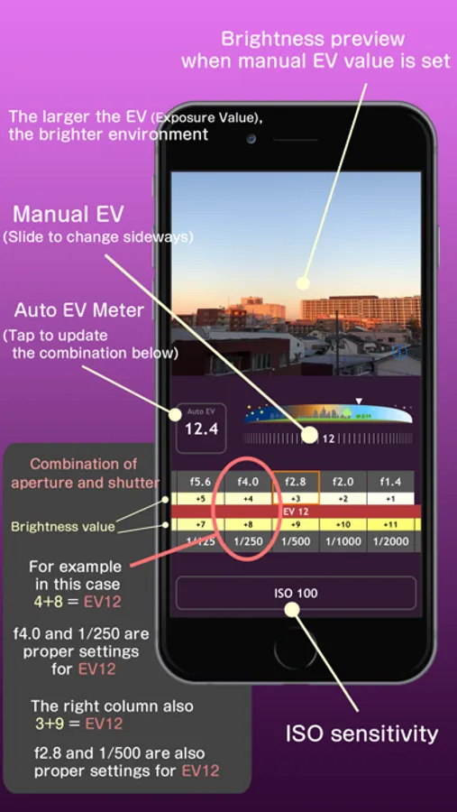 When the left EV button is pressed, the EV value is automatically measured and the combination of the aperture and the shutter speed is displayed.