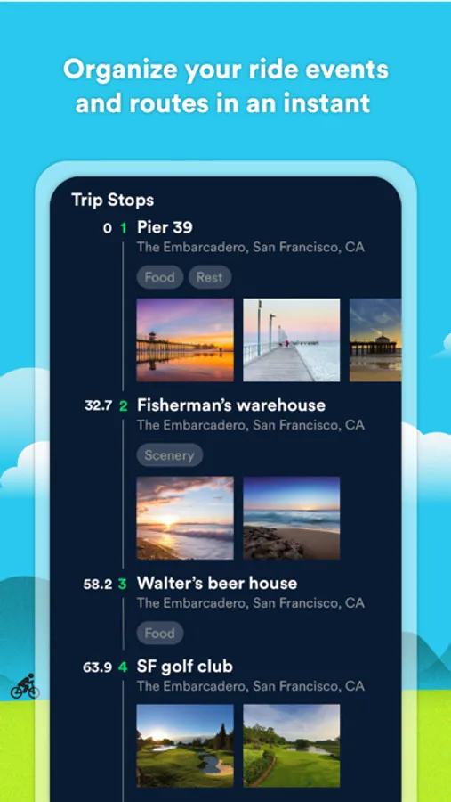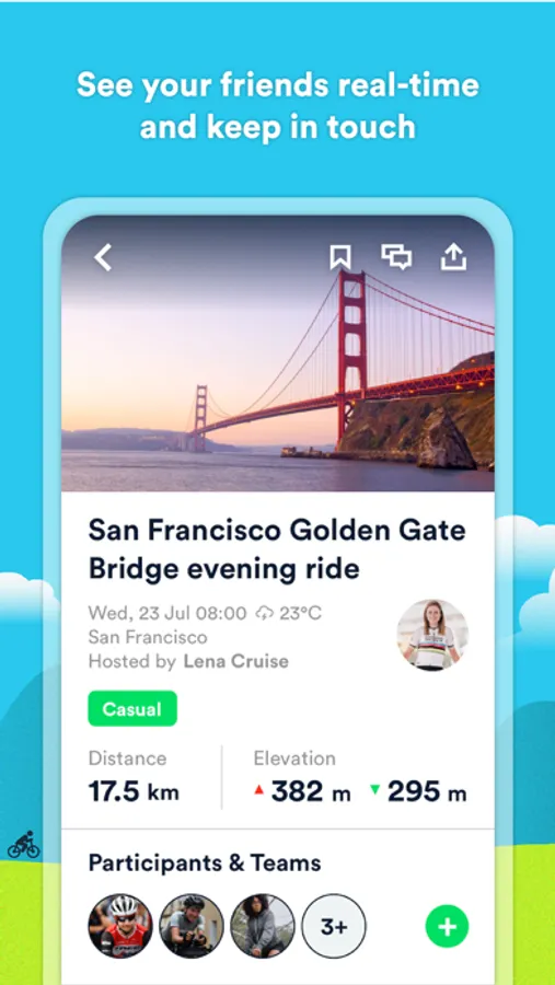 Create cycling events with necessary information like route, elevation, gathering spot, and invite friends to join! Every team member will be notified upon any modification to the event.