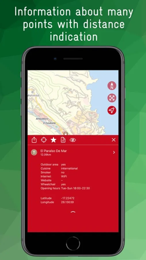 For many POIs there is further information such as opening hours, address, disabled access, ... Notes or favourites can be created for each POI, a history list shows the most recently used POIs, content can be shared.